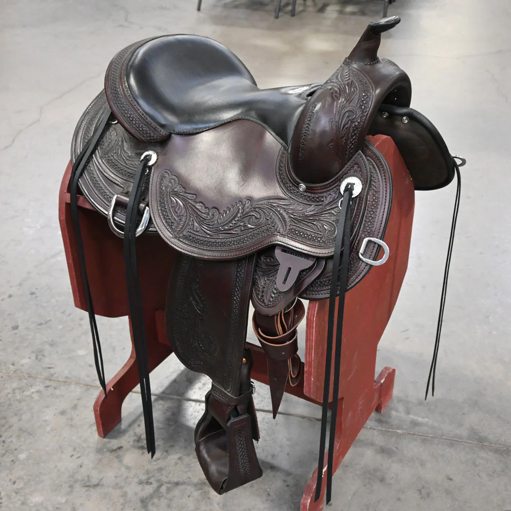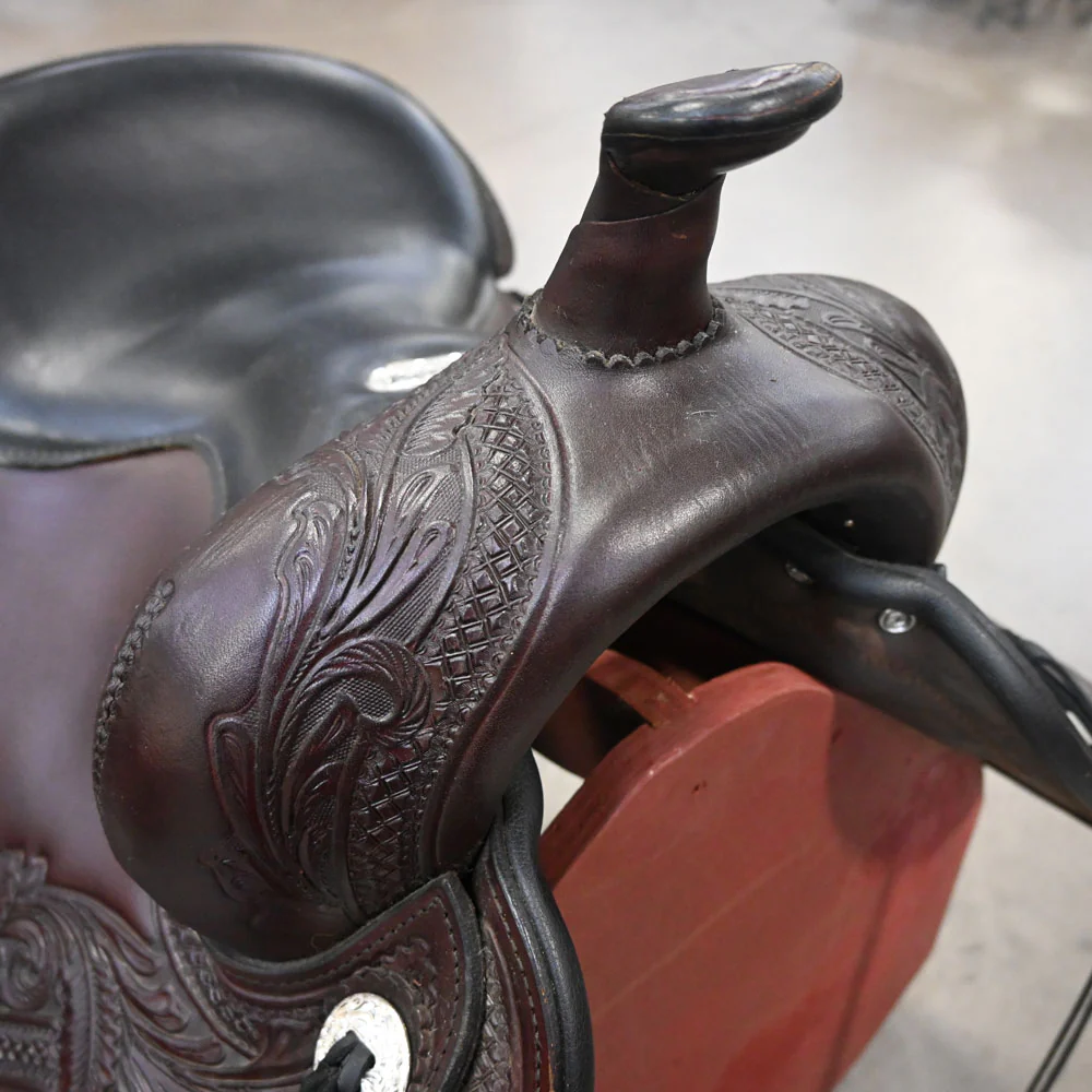 To begine, this used 16″ Circle Y Julie Goodnight comes in a walnut 7/8 floral tooling with a padded seat. For more information call a saddle salesman today.
